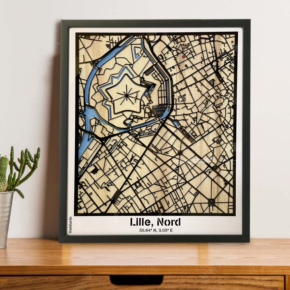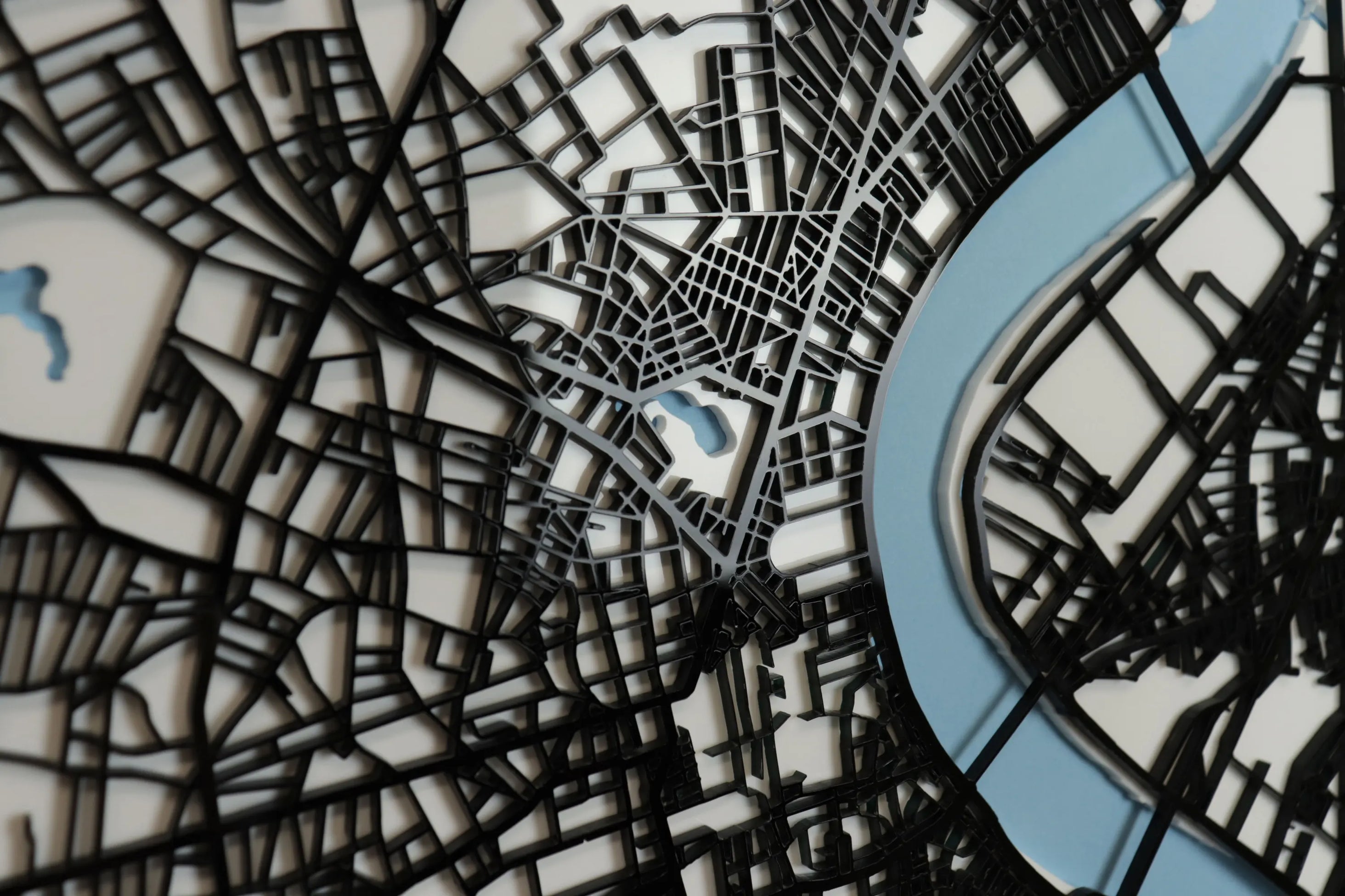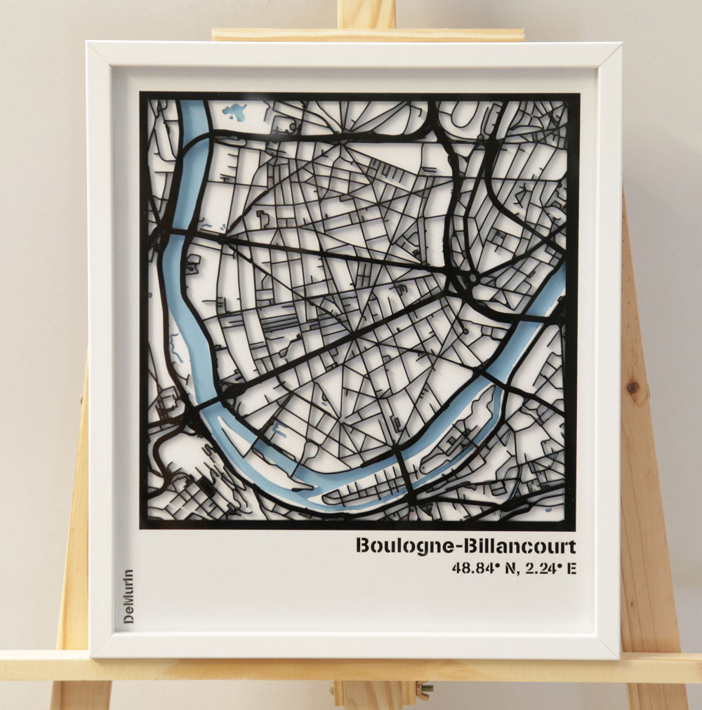 We craft a map of your residence or a location you hold dear. Various paper, wood, Plexiglass® layers are meticulously laser cut and layered to construct a unique piece. Every step of production takes place in France.