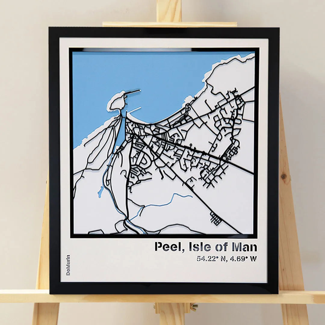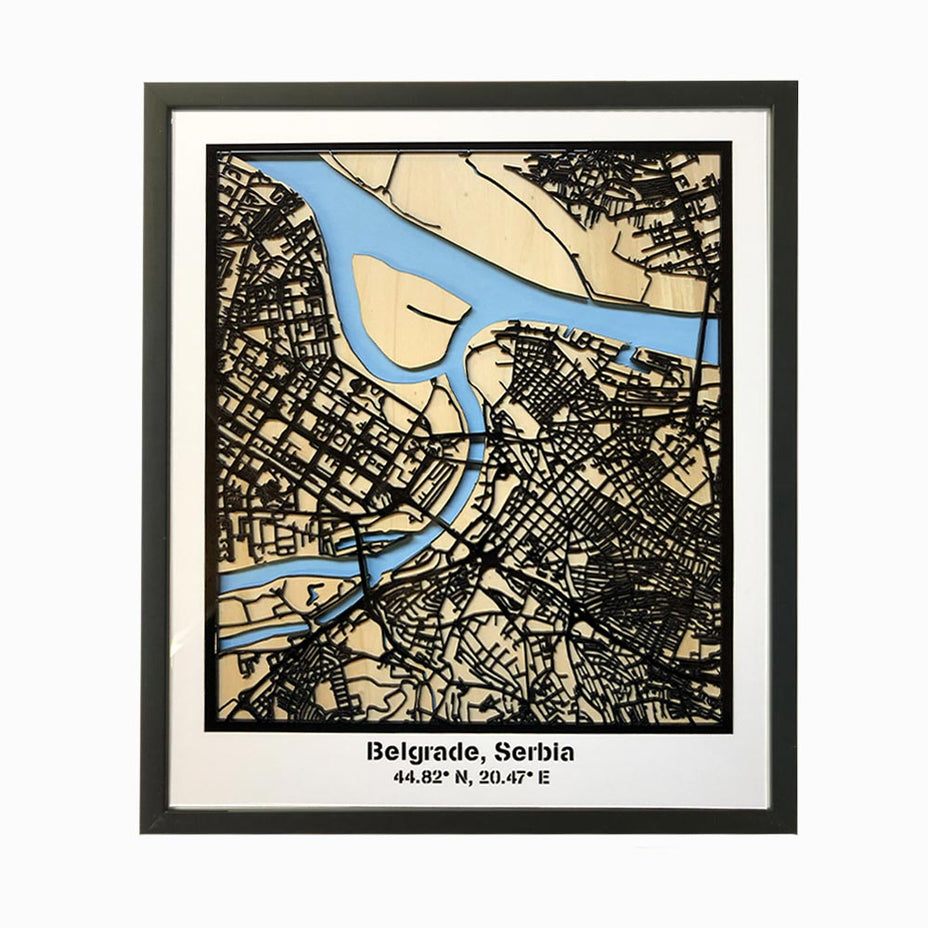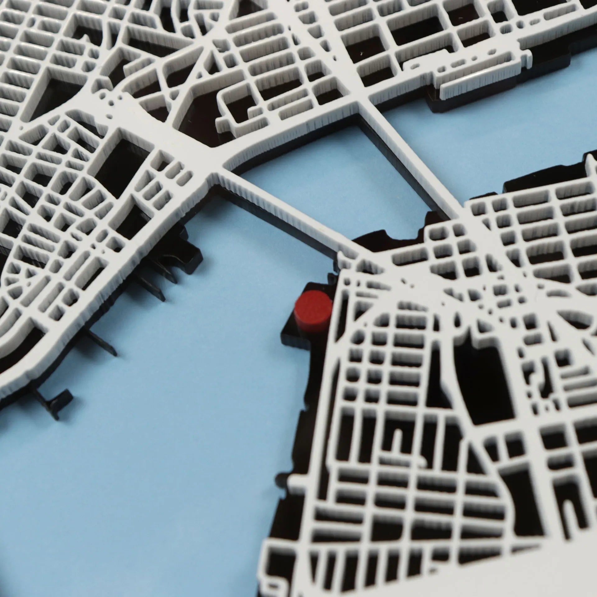 We craft a map of your residence or a location you hold dear. Various paper, wood, Plexiglass® layers are meticulously laser cut and layered to construct a unique piece. Every step of production takes place in France.